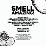 Ingredients: Organic Witch Hazel, Organic Sugarcane, Alcohol, Polysorbate 80, Organic Plant-Based Glycerin & Aromatherapy oil