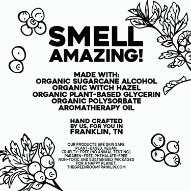 Ingredients: Organic Witch Hazel, Organic Sugarcane, Alcohol, Polysorbate 80, Organic Plant-Based Glycerin & Aromatherapy oil