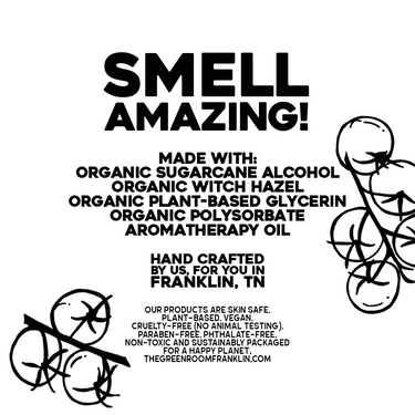 Ingredients: Organic Witch Hazel, Organic Sugarcane, Alcohol, Polysorbate 80, Organic Plant-Based Glycerin & Aromatherapy oil