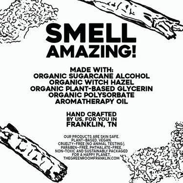 Ingredients: Organic Witch Hazel, Organic Sugarcane, Alcohol, Polysorbate 80, Organic Plant-Based Glycerin & Aromatherapy oil