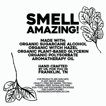 Ingredients: Organic Witch Hazel, Organic Sugarcane, Alcohol, Polysorbate 80, Organic Plant-Based Glycerin & Aromatherapy oil