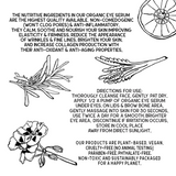 The nutritive ingredients in our Organic Eye Serum are the highest quality available, non-comedogenic (won't clog pores) & anti-inflammatory.